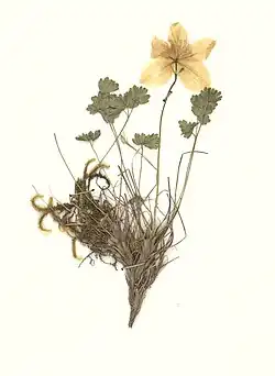 The species's flowers bloom from late May to July. The flowers present singly on scapes and are between 2.5 cm (0.98 in) and 3 cm (1.2 in) in diameter.[3][4][2] The scapes range from 35 mm (1.4 in) to 60 mm (2.4 in) long.[3] All flowers in the genus possess five sepals and five shorter yellow petals.[5] The sepals are purplish red to pink. These sepals are 12 mm (0.47 in) long and 7 mm (0.28 in) wide. The petals are narrowly obovate and range between 4 mm (0.16 in) and 6 mm (0.24 in) long.[2]