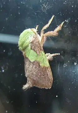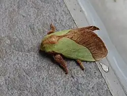 In the male, the head is greenish, with red brown at the sides. The thorax is green with a brown stripe on the vertex. Abdomen brown. Forewings are pale green, resembling the colour of a pea plant. There is a red-brown basal patch on the costa. Outer area is reddish brown, widest at inner margin. Hindwing yellowish at base, reddish brown towards margin. Legs have pale tipped joints. In the female, the reddish-brown stripe on the thorax is much wider and nearly the whole of the hindwing is reddish brown. Larva pale green, whitish or bright yellowish green on the dorsal surface. There are three green bands throughout the body. Sub-dorsal and sub-lateral series of short spinous tubercles, the spines of the anterior and posterior tubercles tipped with red. Cocoon purple brown. Eggs are flat and overlap each other. Eggs are covered by a transparent cement.[3]