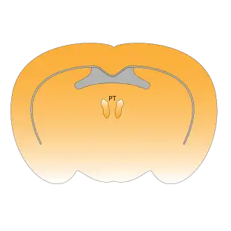 The paratenial nucleus, or parataenial nucleus (Latin: nucleus parataenialis), is a component of the midline nuclear group in the thalamus.[1] It is sometimes subdivided into the nucleus parataenialis interstitialis and nucleus parataenialis parvocellularis (Hassler).[2][3] It is located above the bordering paraventricular nucleus of thalamus and below the anterodorsal nucleus.[4]