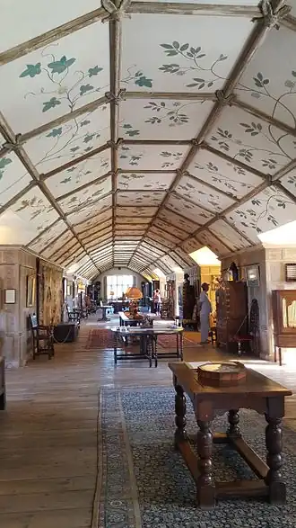 Historic England describes Parham as “one of the finest houses in Sussex”.[1] The principal south front is E-shaped with projecting gabled wings and a central porch, and the west front was partly refenestrated in 1710 under Sir Cecil Bisshopp, 5th Baronet.[1] The house is built of malmstone, Hythe sandstone, Pulborough sandrock and ferricrete rubble with ashlar quoins, under a Horsham slab roof with brick stacks.[1] The entrance was moved to the north side in 1830 to 1840, where a two-storey porch of 1870 faces the Fountain Court laid out in 1870 to 1871.[1][2] The top floor contains a long gallery lit by dormer windows.[1] To the north, the stables and laundry range enclose the court on that side and are listed Grade I; the turret facing the Fountain Court was enlarged in 1870 to 1871.[3][2]