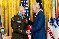 On 3 March 2023, Davis finally received the Medal of Honor 58 years after he was first nominated for it, the third nomination having the direct support and involvement of two different Secretaries of Defense, the Chairman of the Joint Chiefs of Staff, and the President of the United States. In accordance with custom for presenting the Medal of Honor, President Joe Biden presented the Medal of Honor to Davis personally in a ceremony at the White House.