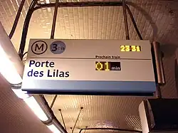 Until 2009, line 3bis and line 7bis were the only lines to not have been equipped with SIEL, a system that provides the waiting time until the arrival of the next two trains. At the end of 2009 and beginning of 2010, the two bis lines were equipped with this system; on these lines, however, the system provides only the waiting time for the next incoming train (as opposed to the times for the next two incoming trains, or four in the case of lines 7 and 13 in the direction of the branch). The installation of this system in the two bis lines completed the system's deployment along Paris' transportation network.[8]