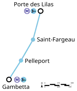 Paris Métro Line 3bis (French: Ligne 3 bis du métro de Paris) is one of the sixteen lines of the Paris Métro. It connects Gambetta and Porte des Lilas in the 20th arrondissement in the east of Paris. With a length of 1.3 kilometres (0.81 mi) and four stations, the line is the shortest in the network. It is also the least used line, with just over 1.6 million passengers in 2003, behind Line 7bis's 3.5 million.