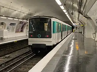 Until 1971, the rolling stock on line 3bis was the same as on line 3.[6] Between 1972 and July 1981, the Sprague-Thomson variant was used, but this was then replaced with MF 67 trains of only three cars (because of the low passenger volumes), which still run on the line today. These trains are identical to those on line 9, except that the 3bis trains do not have strapontins (fold-down seats). By 2027, the MF 67 trains will be replaced by the MF 19 trains.