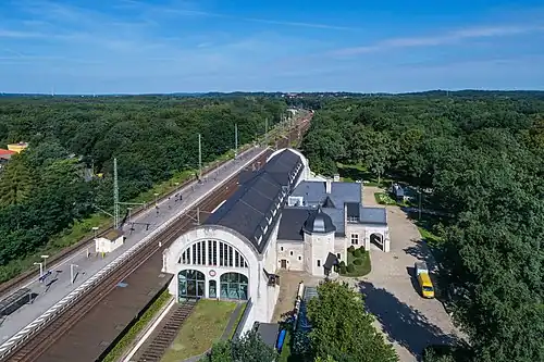 The Wildpark station was built in 1868 on the new line linking Berlin to Magdeburg. At the beginning of the 20th century, after the opening of the bypass lines to Nauen (1902) and Jüterbog (1904), it was built a small rail hub. In 1909 the Kaiserbahnof (see the section below) was inaugurated for the private use of Kaiser Wilhelm II. From 1950, after the division of Germany, the station functioned in the Berlin outer ring (Berliner Außenring), and for some years was served by a holiday express train from Saxony to the Baltic Sea. After the completion of the Golm-Potsdam Pirschheide[4] bypass of the Außerring, the station remained part of a short line[5] to Potsdam Hauptbahnhof (in that period Potsdam Stadt), although still linked to Magdeburg and the ring. This line continued to Potsdam Babelsberg, but service to West Berlin was interrupted due to the construction of The Wall.