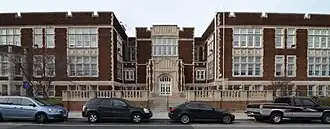 It is constructed of red tapestry brick with trimmings of Bedford limestone and was built on some of the highest ground in the city. Originally a 16-room structure, the school quickly became too small for the needs of the community. In 1920 the progressive platoon school model was adopted which helped address the school's space problem. Two wings were finally added to the building and ready for use by 1931.