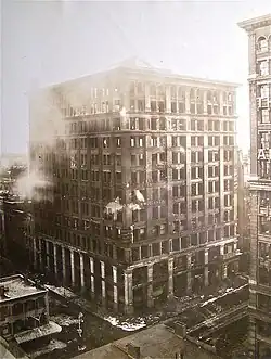 The Parker Building and the adjacent Florence Hotel were burned irreparably by a fire which began on the sixth floor of the Parker Building, on January 10, 1908. A night watchman discovered the flames in rooms occupied by the Detmer Woolen Company. The hotel was separated from the Parker Building by a narrow alley measuring fifteen feet. The conflagration began around 7 p.m., and by 11 p.m. the Parker Building was gutted.[8]