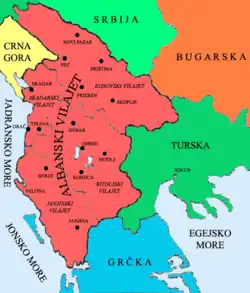 The 1877-1878 Russo-Turkish War severely contracted the Ottoman possessions in the Balkan Peninsula, leaving the empire with only a precarious hold on Macedonia and the western Balkans. Albanians had been under Ottoman Empire since 1479 with the fall of Shkodër. The region claimed by Albanian national leader was ethnically heterogeneous, consisting of large areas inhabited also by Bulgarians, Greeks, Serbians, Turks and Aromanians,[7][8] though Sami Frashëri (or Şemseddin Sami) claimed that Albanians were the majority of the population in the four vilayets of İşkodra, Yannina, Monastir and Kosovo.[9] The first postwar treaty, the abortive Treaty of San Stefano signed on 3 March 1878, assigned Albanian-populated lands to Serbia, Montenegro, and Bulgaria. Austria-Hungary and the United Kingdom blocked the arrangement because it awarded Russia a predominant position in the Balkans and thereby upset the European balance of power. A peace conference to settle the dispute was held later in the year in Berlin. The Congress of Berlin ceded to Montenegro the cities of Bar and Podgorica and areas around the mountain villages of Gusinje and Plav, which Albanian leaders considered Albanian territory, and viewed this as a partition of Albanian-inhabited territories.[10] In February 1879, the Powers insisted that the Porte give up the Albanian-claimed areas of Plava, Podgorica, Gucia and Ulcinj, and withdraw all Ottoman troops from the disputed zones.