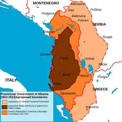 The Partition of Albania (Albanian: Copëtimi i Shqipërisë) is a term used for the partition of the Albanian state, which proclaimed its independence on 28 November 1912. The delineation of the newly established Principality of Albania under the terms of the London Conference of 1912–1913 (29 July 1913) and the Ambassadors of the six Great Powers of that time (Great Britain, France, Germany, Austria-Hungary, Russia and Italy) left Albanian and non-Albanian populations on both sides of the border. Representatives of the Albanian National Movement viewed this as a partition of claimed Albanian-inhabited territories, also territories contained in a proposed Albanian Vilayet.[1][2][3]