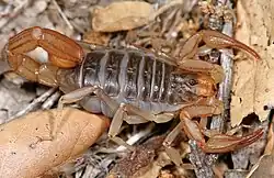 Most individuals are somewhat less than 45 mm (1.8 in) long.[1] It has skinny pinchers, and is generally "mottled dark gray-brown".[1] The name stripe-tailed scorpion is because it has four longitudinal brown lines on the ventral side of the tail.[1]