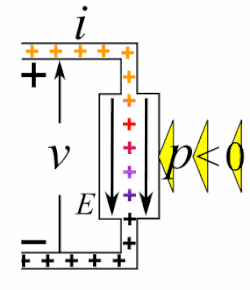 Illustration of the "reference directions" of the current , voltage , and power variables used in the passive sign convention. If positive current is defined as flowing into the device terminal which is defined to be positive voltage, then positive power (big arrow) given by the equation represents electric power flowing into the device, and negative power represents power flowing out.