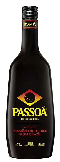 Passoã is a passion-fruit liqueur made in France, with passion fruit being the main ingredient. Invented in 1985, the brand was owned by Rémy Cointreau group.[1] In December 2016 Passoã SAS was established as a result of a joint venture between Lucas Bols and Rémy Cointreau. The product was launched in 1986 in the European market and in 1994 worldwide, and has been a nationally best-selling liqueur in several national markets, including Puerto Rico, the Netherlands and Belgium.[2]
