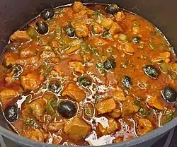 Pork is cubed and sautéed in annatto followed by the sofrito vegetables and seasoning spices. The tomato sauce and water are added, and simmered until the pork is tender. Masa is added to the liquid to the preferred thickness.[12] The stew is garnished with the bell peppers, olives, and cilantro.[18][11]