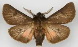 The forewing length is 12.9–13.2 mm and the ground colour is pale ochre yellow but with broad, sometimes entirely confluent dark-brown transverse bands. The pattern elements consist of a dark basal area and sinuous, diffuse dark-brown transverse lines. The hindwing ground colour is pinkish red or rarely yellow with broad dark-brown marginal and costal band.