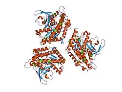 Patatin is a family of glycoproteins found in potatoes (Solanum tuberosum) and is also known as tuberin as it is commonly found within vacuoles of parenchyma tissue in the tuber of the plant. They consist of about 366 amino acids all making up and isoelectric point of 4.9. They have a molecular weight ranging from 40 to 45 kDa, but are commonly found as a 80kDa dimer.[1] The main function of patatin is as a storage protein but it also has lipase activity and can cleave fatty acids from membrane lipids.[2][3] The patatin protein makes up about 40% of the soluble protein in potato tubers.[4] Members of this protein family have also been found in animals.