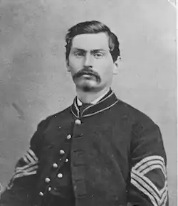 Running ahead of the line, under a concentrated fire, he shot the color bearer of a Confederate regiment on the works, thus contributing to the success of the attack.[1][2]