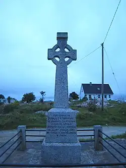 A monument was erected in Derrybeg, Gweedore, in 1954 by a Fianna Fáil committee. The committee consisted of 21 local Fianna Fáil cumann members who held fund-raising events to finance the building of the cross. The Cross was officially unveiled by Cormac Breslin, T.D. The monument stands between the former town hall and a pub. The inscription on the cross reads as follows: