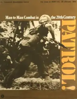 Patrol is a two-player game that aims to simulate small-scale non-urban combat at the individual soldier level, set in various time periods from World War I to 1970. The players each control 5–15 soldiers in scenarios representing real-time combat encounters of 1–5 minutes, with each game turn representing between 5 seconds and 5 minutes.[1]