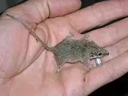 The paucident (from Latin pauci 'few', dentēs 'teeth') planigale differs from other planigales having only two premolars in each tooth row (all other planigales have three). The paucident planigale is recognised by its flattened triangular head and small rounded ears, is mid-grey to cinnamon in colour with a whitish underside. The paucident planigale weighs 6-15 grams, its body is 60mm-80mm long and its tail is 55-70mm long.[4] It feeds on many small creatures, including beetles, locusts, spiders or other arthropods, and even occasionally feeds on small lizards or mammals. The paucident planigale kills small prey with quick bites. Although it is believed that fewer than twenty percent of individuals survive for more than two years, captive animals have reached five years of age.[5]