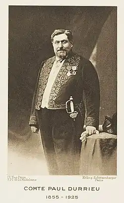 Born in Strasbourg, he was the son of Henri Durrieu (1822-1890), founder and first president of the crédit industriel et commercial, commander of the légion d'honneur and receiver general for Bas-Rhin, and his wife Gabrielle Lacave-Laplagne (1829-1891). Paul had an elder brother Tony (1847-1861),[1] whilst his great-uncle Antoine Simon Durrieu won renown in the French Revolutionary Wars and Napoleonic Wars.[2] He married Françoise Duchaussoy (1869-1949) and had four children with her Jean, Henry, Gabrielle and François.[1]