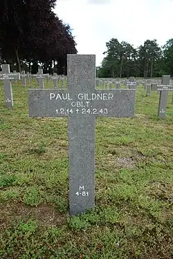Gildner claimed his last two aerial victories on the night of 19/20 February 1943. The claim over two Halifax bombers north of Vlieland may have been misidentified Avro Lancaster bombers from No. 156 Squadron RAF and No. 467 Squadron RAAF (Royal Australian Air Force).[31] On 24 February 1943 flying near Fliegerhorst Gilze-Rijenin the Netherlands in his Messerschmitt Bf 110 G-4 (Werksnummer 4846—factory number), he attempted landing but had visibility issues due to fog and engine trouble. Following engine failure and fire, he ordered his radio operator Unteroffizier Heinz Huhn to bail out. [32] and crash landed his aircraft at a crossroads on the outskirts of the town Dongen, just near Fliegerhorst Gilze-Rijen at 22.45 hrs. Still alive but unable to escape the aircraft, Gildner perished in the flames. Two eye witnesses wanted to help him but were kept at a distance by the exploding ammunition. Gildner was posthumously awarded the Knight's Cross of the Iron Cross with Oak Leaves (Ritterkreuz des Eisernen Kreuzes mit Eichenlaub) on 26 February 1943. He was the 196th member of the German armed forces to be so honored. Gildner is buried at the German War Cemetery Ysselsteyn (Block M—Row 4—Grave 81) at Venray.[22]