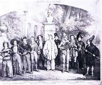 Gautier's remark about Legrand's black suit says something else about the mime: that he was as comfortable in character costume (Deburau initiated the practice)[18] as he was in the garb of Pierrot. About this Gautier was ambivalent: the "truthfulness" of Legrand's acting was unprecedented, but how welcome it was for the spectator still enchanted by the fantasy of Deburau's stage was a valid question: "By virtue of the verisimilitude of his acting", writes Gautier, "[Legrand] turns the fantastic type into a human character whose white face comes as a surprise. He often even abandons the linen blouse and trousers, retaining only the plaster mask, in order to represent beings that are more real."[19] The "realism" of Legrand's pantomime marked a dramatic—and, for some, a disturbing—turn in the fortunes of Pierrot.