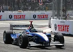He returned to Forsythe for the 2005 season to drive the No. 3 car.[35] Tracy started on pole position at the season-opening Toyota Grand Prix of Long Beach and finished second.[35][137] Two races later, in the Time Warner Cable Road Runner 225 at Milwaukee, he qualified fifth and led 192 of 225 laps to earn his fourth victory at the track.[138] Tracy then won the Grand Prix of Cleveland from pole position, leading 46 of 91 laps and taking the championship lead from Sébastien Bourdais.[137][139] He lost the points lead to Bourdais when his car ran out of fuel in the following Molson Indy Toronto after the two were involved in an unrelated collision at the pit lane exit.[137][140] In the last seven races, he finished on the podium three times and took pole in Denver,[35] where he led 59 laps before crashing.[141] Tracy led a race-high 107 laps in the Hurricane Relief 400 at Las Vegas Motor Speedway before being hit in the rear by Bourdais, ending his race early.[142] He placed fourth in the championship standings with 246 points.[35]
