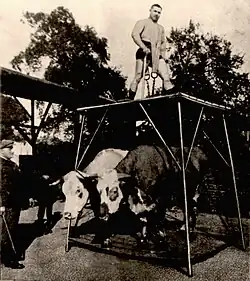His most well-known feat was when he stood on a scaffold and lifted up a platform holding two full-grown oxen (total weight: 2,064 kg or 4,550 lb) almost half a meter high on an iron chain.[2]