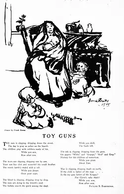 Today Barrington is known for her antiwar poem "Education". The poem was originally published with the title "Toy Guns" in the socialist monthly The Masses in May 1916.[15] As Margaret Jones points out, "Long before the United States entered the war in 1917 (an event which was to lead to the closing down of the magazine, and the trial of its editors, under the Espionage Act), every issue [of The Masses] carried antiwar cartoons, reports from the European fronts, and pacifist poetry. A significant proportion of these antiwar gestures were the work of women".[16] By 1918, the poem was retitled "Education" and included in Poems Written During the Great War, 1914-1918: An Anthology.[8]