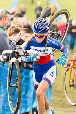 Pauline Ferrand-Prévot (French pronunciation: [polin fɛʁɑ̃pʁevo]; born 10 February 1992) is a French cyclist who rides for UCI Women's World Tour team Visma–Lease a Bike.[5] In addition to road racing, Ferrand-Prévot has also competed in mountain biking and cyclo-cross during her career,[6] winning the world title in each discipline. During the 2015 season, aged just 23, she became the first person in the history of cycling to simultaneously hold the world road title, world cyclo-cross title and world cross-country mountain bike title.[7]
