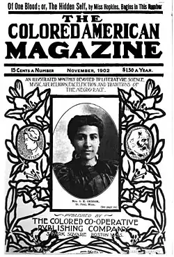 At times going by the pseudonym Sarah A. Allen, Hopkins through her work at the Colored American began to gain recognition in the public eye. As a result of this, she was offered the opportunity to become a member of the board of directors, a shareholder and a creditor of the magazine. Along with her writing, she helped to increase subscriptions and raise funding for the magazine as a co-founder of "The American Colored League", which was an organization started in 1904 with the mission of promoting the interests of the Colored American.[5] These roles alone helped her break into the literary world, with her work making up a substantial amount of the literary and historical materials promoted by the magazine. She would continue to work for the magazine until she left in September 1804 due to health complications.[5] By her final issue, a total of six of Hopkins' short stories had been published in the magazine, including the well-known mystery "Talma Gordon", as well as two of her novels, Winona: A Tale of Negro Life in the South and Southwest and Of One Blood or The Hidden Self.[5]
