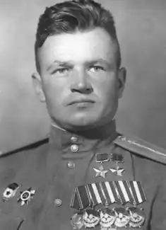 In February he became the commander of the first squadron; he scored his last two aerial victories upon shooting down two Fw 190 on 25 April 1945. By the end of the war he had accumulated 31 personal aerial victories, one group victory, flew 457 sorties and engaged in 125 aerial battles. He was awarded the title Hero of the Soviet Union a second time on 29 June 1945.[5]