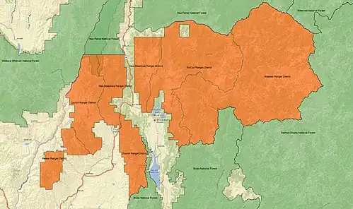 The Payette National Forest is a U.S. National Forest located in central western Idaho, in parts of Valley, Idaho, Adams, and Washington counties. The land area consists of approximately 2.3 million acres (9,300 km2) of federally managed lands. It is bordered by Hells Canyon National Recreation Area and the Hells Canyon to the west, Salmon-Challis National Forest to the east, Boise National Forest to the south, and the Nez Perce National Forest to the north. The Payette National Forest is a part of the Intermountain Region (Region 4). It is under the jurisdiction of a forest supervisor in McCall and is divided into five ranger districts: McCall, Krassel, New Meadows, Council, and Weiser.