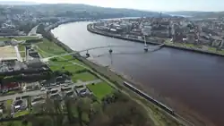 The Peace Bridge is a cycle and foot bridge across the River Foyle in Derry, Northern Ireland. It opened on 25 June 2011, connecting Ebrington Square with the rest of the city centre. It is the second most recent of four bridges in the city, the others being the Craigavon Bridge and the Foyle Bridge and more recently the Pennyburn Bridge. The 235 metres (771 ft) bridge was designed by AECOM, who also designed the Sutong Yangtze River Bridge, and Wilkinson Eyre Architects, who also designed the Gateshead Millennium Bridge.[3][4]