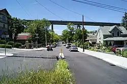 Access to the neighborhood was difficult due to the surrounding terrain, but became easier in when the Monroe Street Bridge was constructed in 1911. Main Avenue, which intersects with Monroe Street immediately south of the bridge span, was regraded to the west of the bridge as it descended from Downtown Spokane into Peaceful Valley. The hill was steep, but much more passable for contemporary vehicles. In the western and more isolated end of the neighborhood, known as Bennett's Addition, roads were nothing more than dirt trails into the 1930s.[2]
