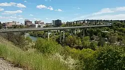 For cyclists and pedestrians there is a shared use path running along the river from Glover Field to People's Park, where it connects to the Spokane River Centennial Trail on the other side of the river via the Sandifur Memorial Bridge.[18] The city is moving forward with a 2021 proposal that would connect the Peaceful Valley path from People's Park to the Fish Lake Trail which heads south.[19] There are two public staircases that connect Peaceful Valley with the land directly above. One is located at the intersection of Cedar and Wilson and rises to reach the intersection of Cedar, Riverside and Sprague on the western edge of downtown. These stairs were rebuilt in 2018. The other, the only wooden staircase the city maintains, is located on the other end of the neighborhood at Spruce Street where it climbs to Riverside Avenue in Browne's Addition at the Northwest Museum of Arts and Culture. It is believed to be the oldest location of a staircase in the city, perhaps dating back over 130 years.[20]
