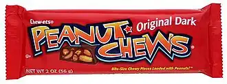 Peanut Chews are a family of candy bar products manufactured by American company Just Born. They consist of peanuts and molasses covered in chocolatey coating, and are available in original dark chocolatey flavor and milk chocolatey coatings. The bars are small, similar in size to a "fun size" or Halloween-size bar. They are especially familiar to residents of Philadelphia, the Philadelphia area, and neighboring Mid-Atlantic states.