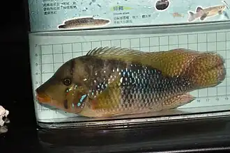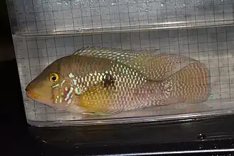 The pearl cichlid (Geophagus brasiliensis) is a species of fish in the North American cichlid family. It is native to southeastern Brazil (north to Bahia), Paraguay, Uruguay and far northeastern Argentina,[1] where it is found in rivers, lakes, and nearby slightly brackish lagoons.[2][3] It has been introduced to several countries far from its native range, including the United States, Australia, the Philippines, and Taiwan.[2] This species is popular among aquarists.[3]