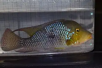 The males can reach a length up to 25 cm (9.8 in), while females only reach a bit more than half that size.[2] Its main body colour can be pale light brown to dark blue or almost purple; their colours change with moods and during mating sessions. The pearl cichlid has one dark spot which may visible on its body, located towards its tail; it also may display several black bands running top to bottom down its body. Its markings, which cover its body, are bright blue speckles which shine brightly in a healthy fish; they have red fins which may have blueish tones and be tipped in black, but these colours also may change, brighten, or fade depending on the mood. They can grow quite large, with males reaching just over a foot and females generally a little smaller. In a group, they usually pair up once they are around 2–3 in long; at this time they can be quite territorial, and keep other fish away from their breeding space.