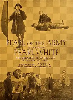 Pearl of the Army is a 1916 American silent film serial directed by Edward José. The Pathé-Astra Film Corp movie was made when many early film studio and film producers in America's first motion picture industry were based in New Jersey's Hudson River towns, particularly Fort Lee.[1][2][3][4] Prints and/or fragments were found in the Dawson Film Find in 1978.[5][6]