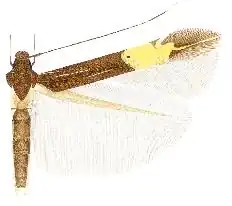 Male. Forewing length 3.9 mm. Head: frons shining ochreous-white, vertex and neck tufts shining dark brown with greenish and reddish reflections, collar shining dark brown; labial palpus first segment very short, white, second segment three-quarters of the length of third, dark brown with white longitudinal lines laterally and ventrally, third segment white, lined brown laterally; scape dorsally shining brown with a white anterior line, ventrally shining ochreous-white, antenna shining dark brown with a white line from base to two-thirds, followed towards apex by an annulate section of four segments, two white, two dark brown, two white, ten dark brown and eight white segments at apex. Thorax and tegulae shining dark brown with greenish and reddish reflections. Legs: shining dark greyish brown, foreleg with a white line on tibia and tarsal segments one to three and five, segment four with a white apical ring, tibia of midleg with white oblique basal and medial lines and a white apical ring, tarsal segments one, two and four with white apical rings, segment five entirely white, tibia of hindleg as midleg, tarsal segment one with white basal and apical rings, segment two with a white apical ring, segments three to five with white dorsal line, spurs ochreous-white dorsally, ochreous-grey ventrally. Forewing shining dark brown with reddish gloss, four very narrow silver white lines in the basal area, a short subcostal from base to one-sixth, slightly bending from costa, a medial from one-sixth to one-third, a subdorsal from one-third to just before one-half, a short and very indistinct dorsal from base, a pale yellow transverse fascia beyond the middle with a prolongation towards apex and with a long and narrow apical protrusion in the middle, bordered at the inner edge by two tubercular pale golden metallic subcostal and subdorsal spots, the subcostal spot more towards base and with a small patch of blackish brown scales on the outside, bordered at the outer edge by two tubercular pale golden metallic costal and dorsal spots, both spots opposite, the costal spot inwardly lined dark brown, the dorsal spot twice as large as the costal, a white costal streak from the outer costal spot, a yellowish apical line from the apical protrusion to apex, cilia dark brown around apex, paler towards dorsum. Hindwing shining pale brownish grey, cilia greyish brown. Underside: forewing shining dark brown, the apical line indistinctly visible, hindwing pale brownish grey. Abdomen dorsally dark greyish brown, ventrally shining white, anal tuft ochreous-white.[1]