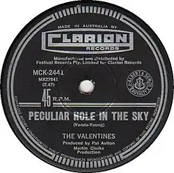 "Peculiar Hole in the Sky" is a song written by Harry Vanda and George Young. It was originally recorded by the Australian rock group the Easybeats in 1967, but left unreleased until 1969. The song would later be given to Australian rock group, The Valentines, which included singer Bon Scott, who would later join George Young's brothers Malcolm Young and Angus Young in AC/DC. The Valentines version would be released in August 1968.[1]