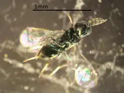 Pediobius foveolatus (Crawford) (Fig. 1 and 3), is a tiny exotic parasitoid wasp that is used for biological control of Mexican bean beetle, Epilachna varivestis (Fig. 2), an important insect pest of snap beans, lima beans, and sometimes soybeans mainly found at economic levels in the eastern United States. Pediobius foveolatus is in the family Eulophidae, and is the most successful biological control agent for Mexican bean beetle. This wasp only attacks beetle larvae, not eggs or adults. It is commonly used by smaller, organic growers; but is also mass released throughout the state of New Jersey, by their state department of agriculture.[2][3]