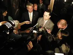 Though there were 32 Democrats and 30 Republicans in the Senate, on June 8, 2009, Espada and Hiram Monserrate (D-Queens) were part of what was described by the Associated Press as a "parliamentary coup" and voted with the 30 Republican members to install Senator Dean Skelos (R-Nassau) as the new majority leader of the Senate, replacing Senator Malcolm Smith (D-Queens).[23][24] In a press release posted to his Senate web page, Espada emphasized that "I remain a staunch, reform Democrat. I have not switched parties," and that his actions were intended to help end the "gridlock, paralysis, secretiveness, threats and partisan politics" that the Senate had experienced in the previous months and that he was not part of "a power grab or a coup" but was working to build a coalition to serve the needs of all New Yorkers with open and transparent government.[25] However, when pressed by Wayne Barrett on June 11, 2009, as to whether he felt allegiance to the Democratic party, the Senator claimed he owed nothing to a political party that spent "hundreds of thousands" to defeat his past elections.[26]