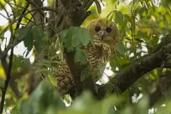 Pel's fishing owl (Scotopelia peli) is a large species of owl in the family Strigidae, found in Africa. It lives near rivers and lakes, and feeds nocturnally on fish and frogs snatched from the surface of lakes and rivers. The species prefers slow-moving rivers with large, overhanging trees to roost in and forage from.[3] It nests in hollows and the forks of large trees. Even though two eggs are laid, often only one chick is raised.