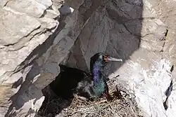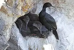 The pelagic cormorant breeds on rocky shores and islands. They do not form large colonies, but smaller groups may nest together. In some cases these birds alternate between two or three nesting sites in a region from one year to another. The nest is built at the cliff face, usually on ledges, less often in crevices or caves. The nest is built from stringy plants, such as grasses or seaweed, and held together by the birds' own guano. Once the birds have found a nest site they like, they tend to remain faithful to it for the rest of their lives. The nest is repaired and improved in each season if need be; it can thus grow up to 5 ft (1.5 m) deep.[2]