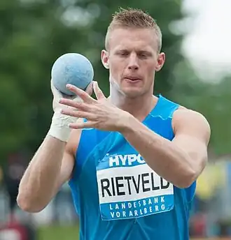 Pelle Rietveld (born 4 February 1985, in Boskoop) is a Dutch decathlete. He competed at the 2013 World Championships in Moscow, Russia. He is also a very good javelin thrower with a PB of 71.66 metres. Right now he is the trainer from Nadine Broersen.