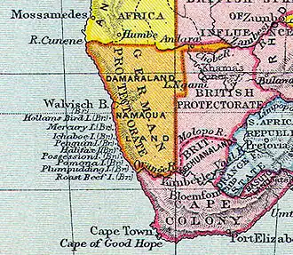 British interference and the resulting breakdown in relations between the British Empire and the local Cape government obstructed the Commission's work long enough for Germany to declare South West Africa a German protectorate in 1884 as part of the continent-wide Scramble for Africa. The offshore islands (and Walvis Bay) were excluded from German administration by their status as Cape constituencies.[4] This status was recognised by Germany in 1886. Thus, although close to the mainland, the islands were not part of German South West Africa.[5]