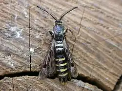 In males the abdomen shows four yellow bands of the same width on seg IV to VII, while females have three bands only (on seg IV to VI), with an orange-brown tail. Antennae are cristate and double-crescent-like shaped in males, while in females they are setaceous.[5][6] The caterpillars are whitish and have a black head.