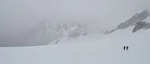 ![]() Hikers cross Penny Royal Glacier during an August snowstorm | |